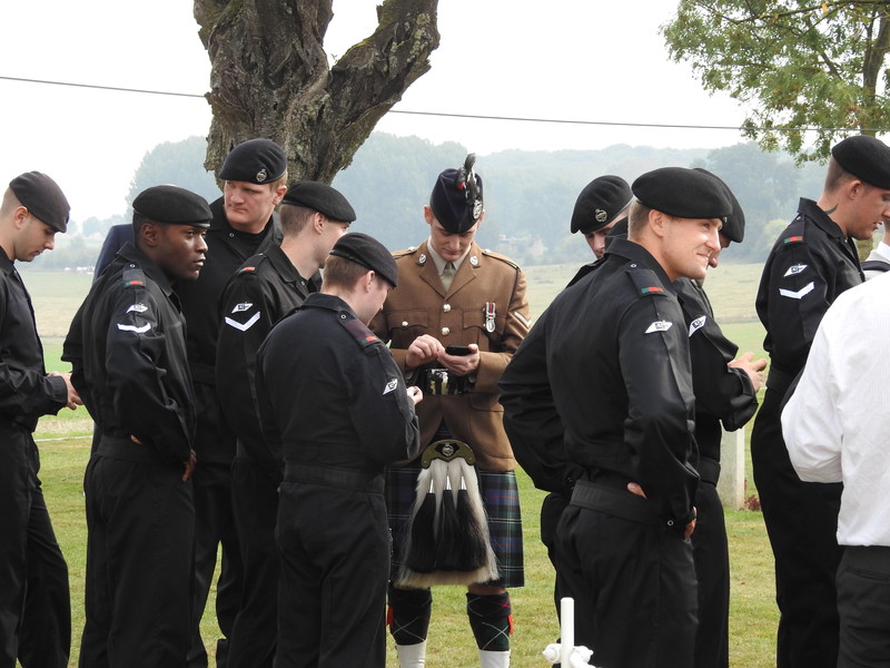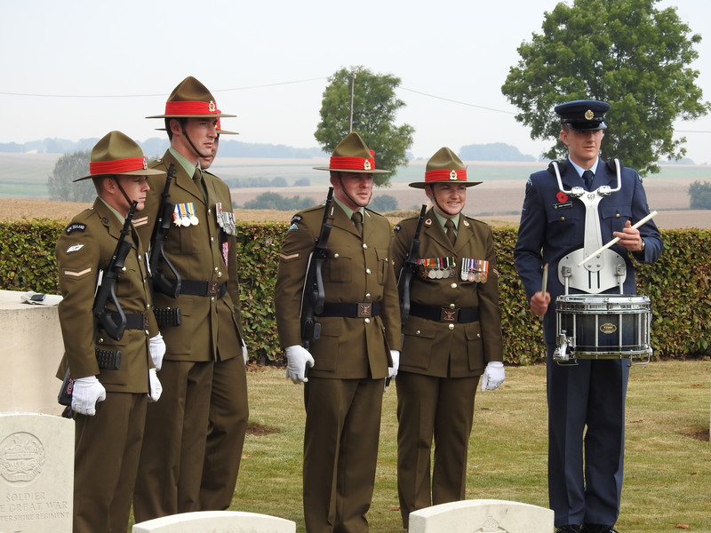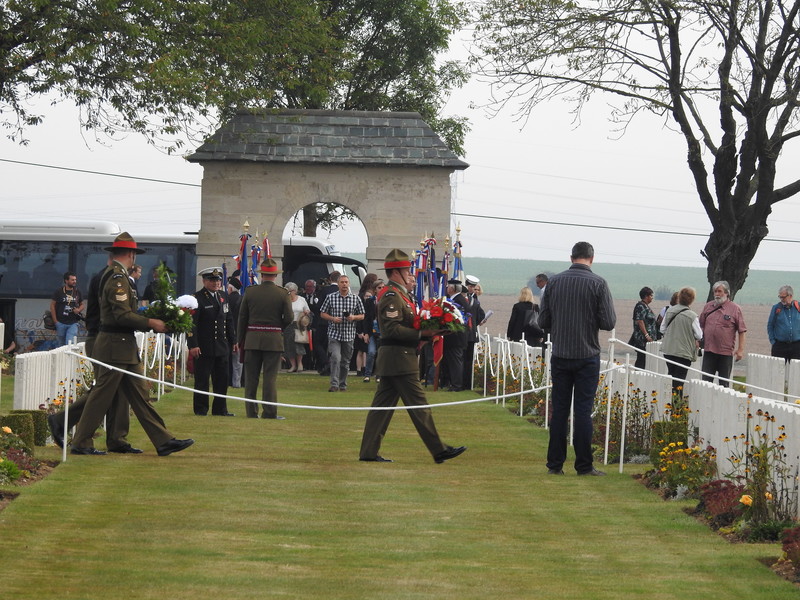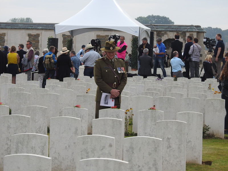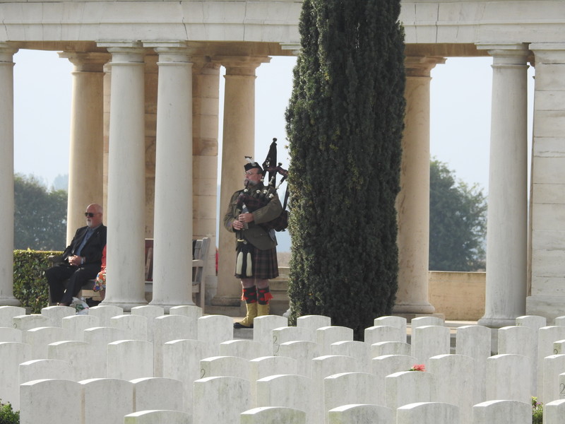 Dawn had brought a sunny morning and as our numbers grew we were screened through security and taken out to Caterpillar Valley Cemetery and the New Zealand Memorial to the Missing. Most of us had a good hour to wait on the Official Party and we were entertained by Pipe Major Yves Holbec of the Somme Battlefield Pipe Band.