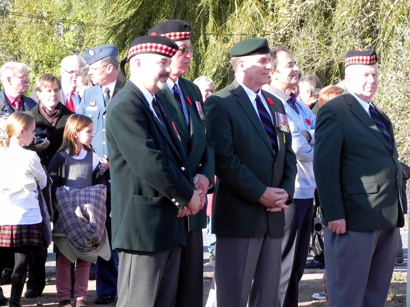 Following the unveiling of the plaque by M Iéraci and Lt Colonel Newman the musicians from Festubert’s Harmonie sounded Aux Morts. The minute’s silence was terminated by the exhortation being proclaimed in English by General Young and in French by Stephan Tremblay, a former Captain with the Highlanders. The flowers of the Forest played by Conny Beckman of the Passendale Pipe Band completed the honours to the fallen.